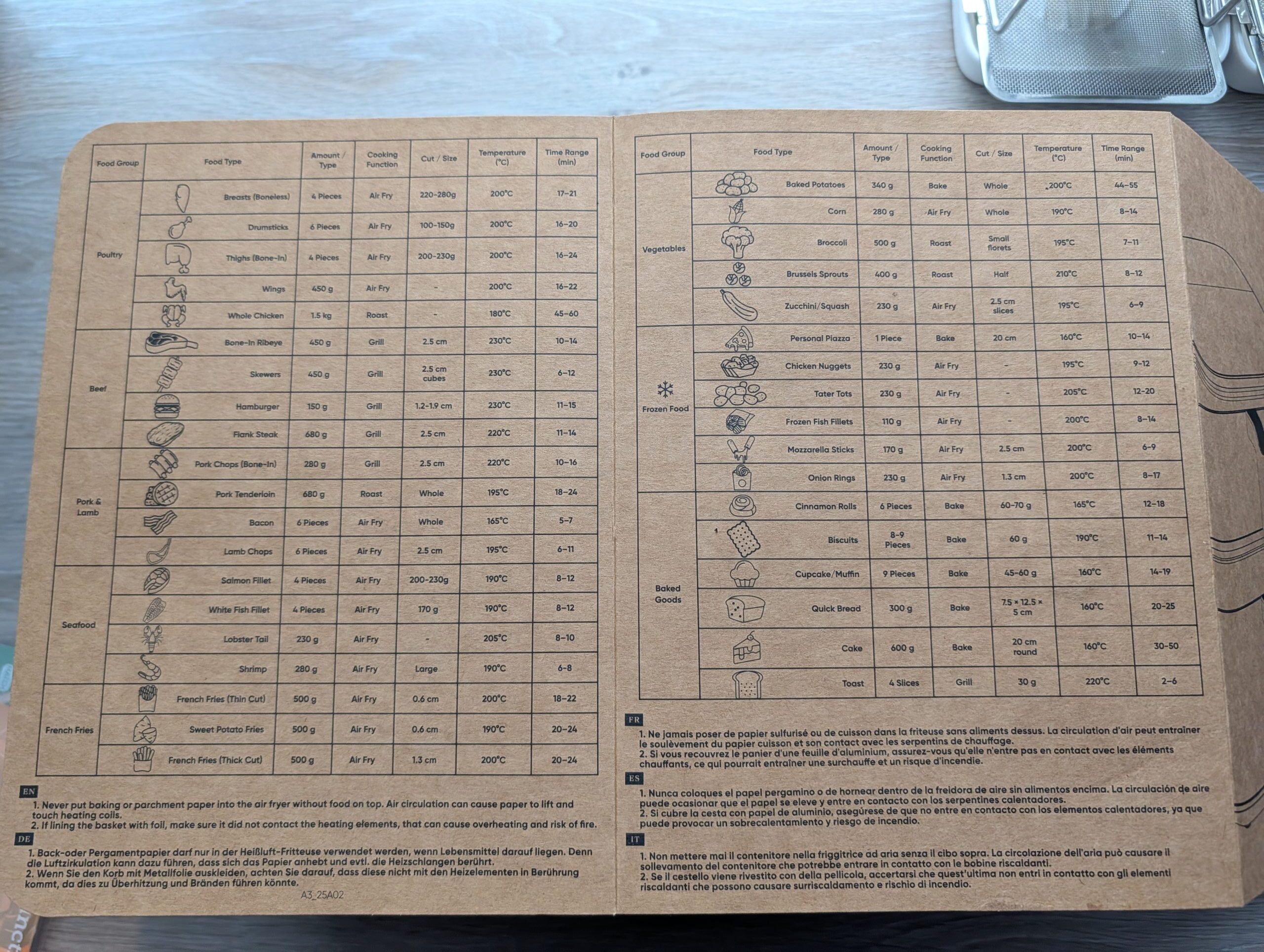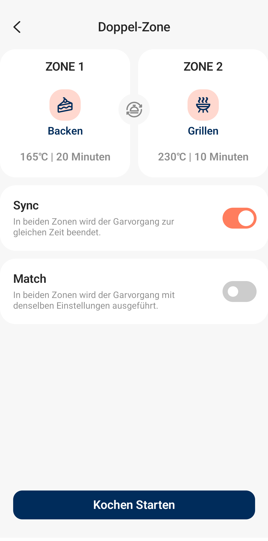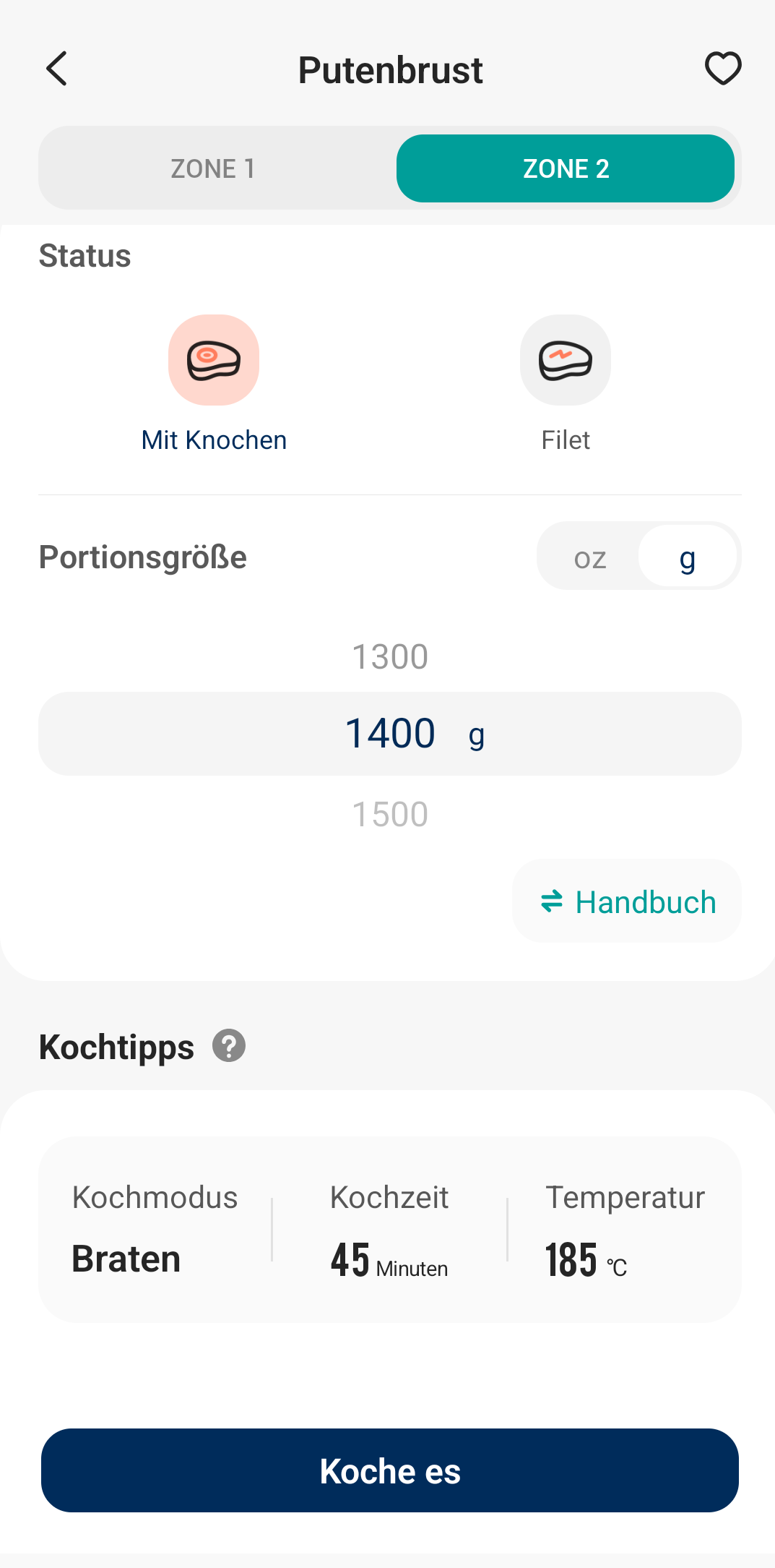 Warum ist das praktisch? Ihr könnt die Garzonen vorbereiten, alles einstellen, und wenn ein anderes Familienmitglied nach Hause kommt, muss die Zubereitung nur noch mit einem einzigen Klick gestartet werden. Wer sich unsicher ist, wie lange etwas zur Zubereitung braucht und ob Grillen oder Braten die bessere Wahl ist, nutzt die Kochtabelle und geht auf Nummer sicher.
