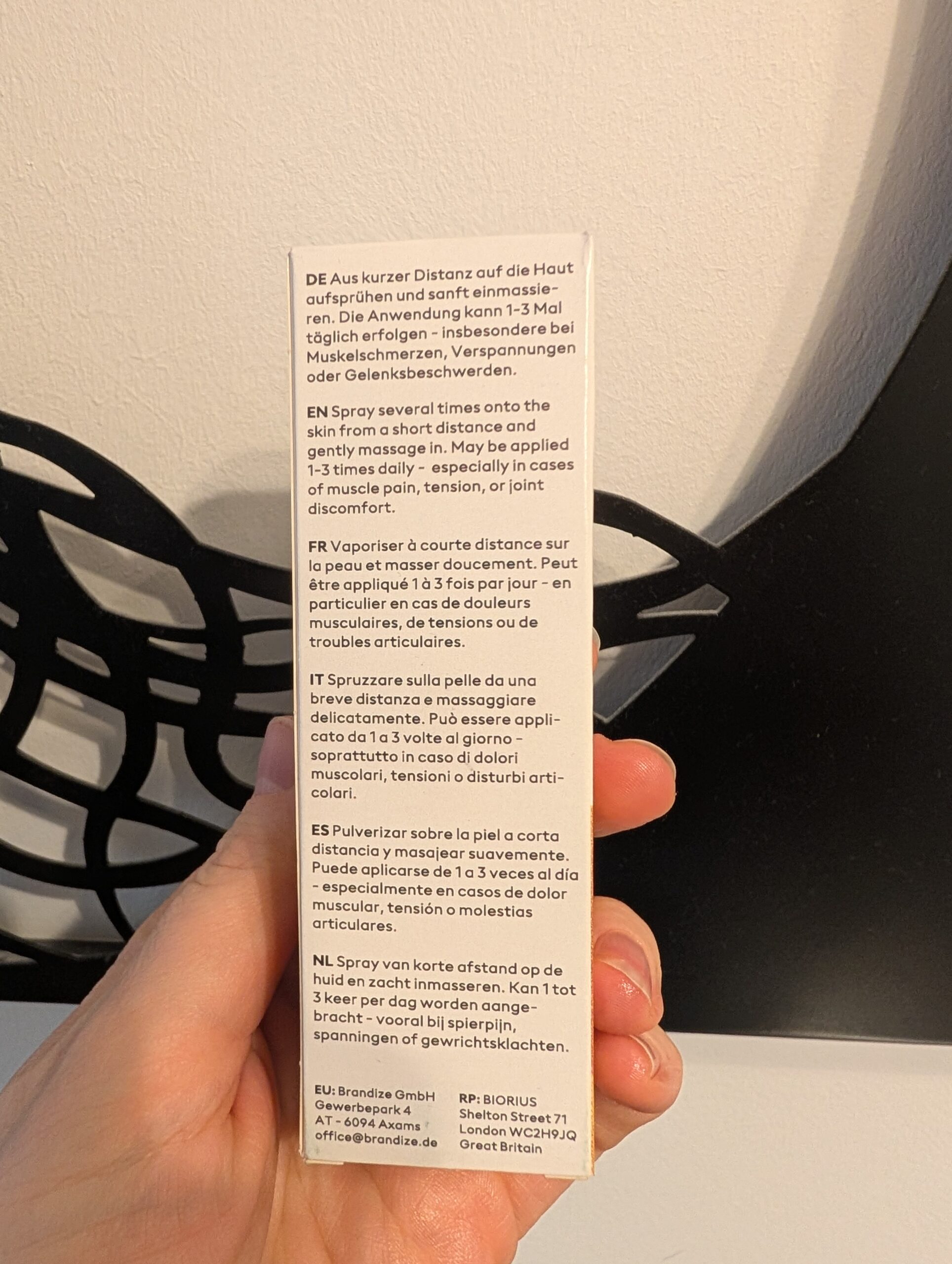 Das Öl wird direkt auf die betroffenen Muskelpartien aufgesprüht und anschließend sanft einmassiert. Empfohlen werden maximal 3 Anwendungen täglich mit jeweils bis zu 5 Sprühstößen pro Stelle.