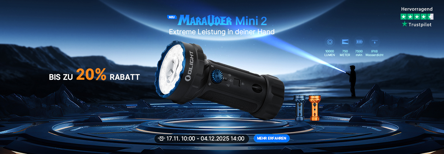 Vom 17.11 bis zum 04.12.2025 findet der Black Week Sale bei Olight statt! Neben vielen Angeboten (bis zu 50 % Rabatt!) erhältst du auch die neue Olight Marauder Mini 2 mit 20 % Rabatt!