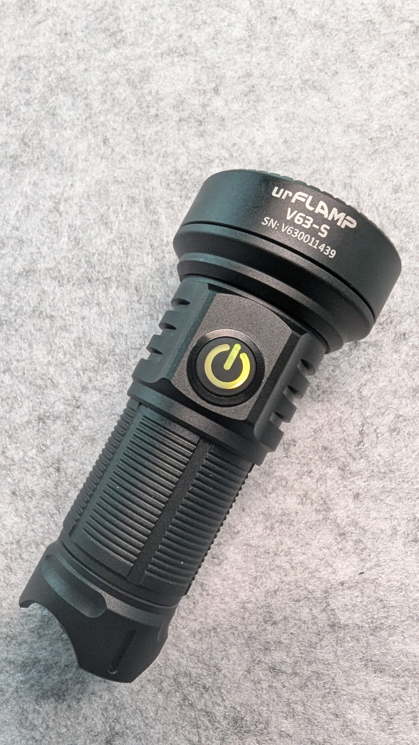 Die Lampe überzeugt mit einem klassischen, unaufdringlichen Design moderner Taschenlampen. Zahlreiche Rillen und Erhebungen sorgen dafür, dass sich die Position der Lampe in der Hand gut ertasten lässt. Ein leicht hervorgehobener Bedienknopf und der große Lampenkopf sind charakteristische Merkmale der urFlamp V63-S.