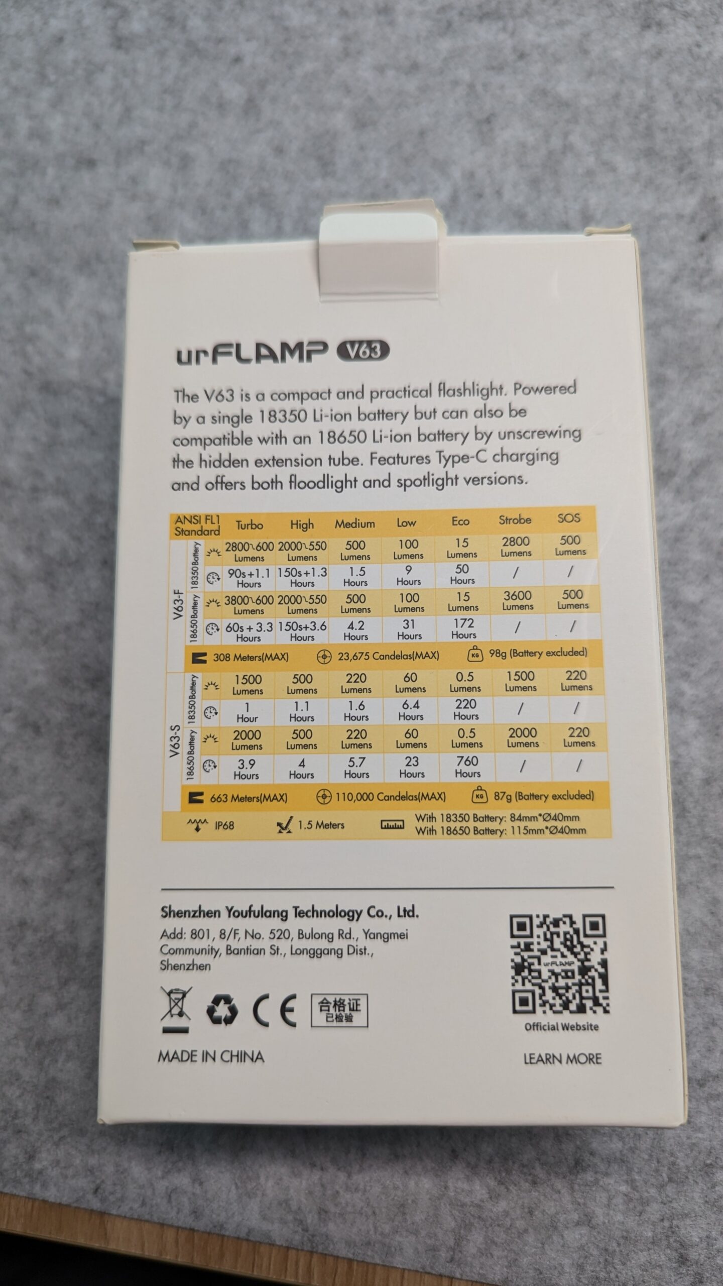 Ausgeliefert wird die urFlamp V63-S mit einem 18350-Akku. Die Taschenlampe ist jedoch auch mit dem leistungsstärkeren, jedoch größeren 18650-Akku kompatibel.