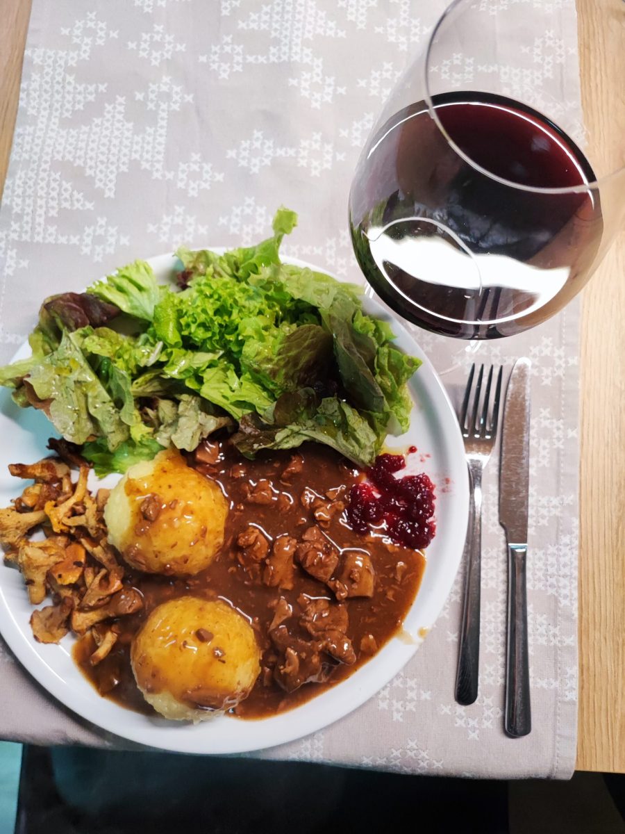 Reh-Gulasch mit Cognac war die erste Wildspezialität, die wir zubereitet haben. Den Gulasch kann man langsam in einem Topf erwärmen, das ist einfach. Dazu gab es Knödel, frische Pfifferlinge, Preiselbeermarmelade und einen grünen Salat. Optisch konnte das Gericht sofort überzeugen und auch der Geruch war vielversprechend.