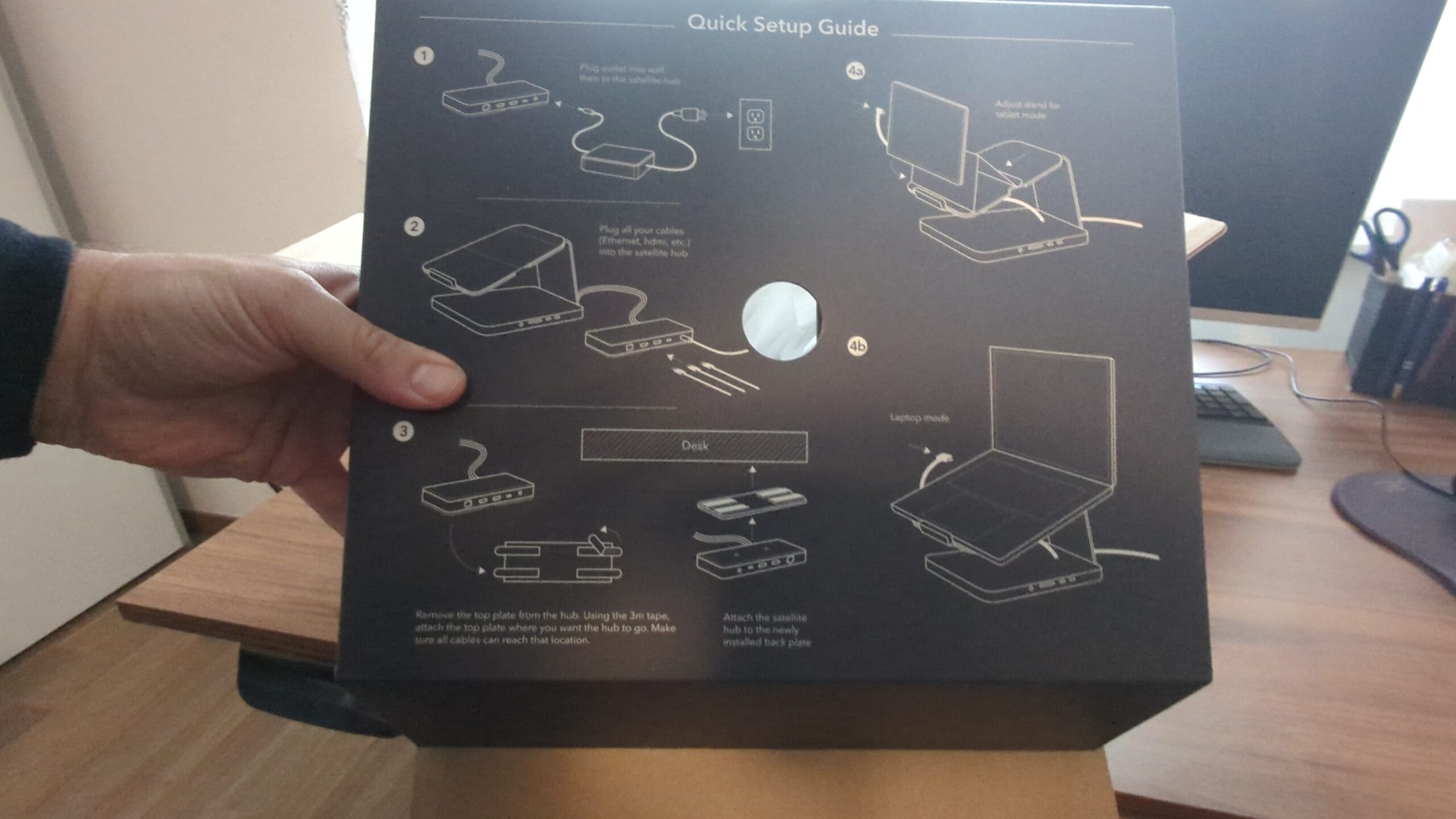 Dank des integrierten Ständers finden sowohl Laptop als auch Tablet einen sicheren Platz und werden auf Augenhöhe positioniert – ideal für eine ergonomische Arbeitshaltung. Die übersichtliche Anordnung der Anschlüsse sorgt zudem für eine saubere Kabelführung und ermöglicht schnellen Gerätewechsel, ohne das Setup zu stören. Mit der mitgelieferten Halterung inklusive Klebestreifen kann der Dock fast unsichtbar an der Tischunterseite montiert werden – für einen aufgeräumten, cleanen Arbeitsplatz. Bei Bedarf lässt sich die Halterung jederzeit wieder ablösen.