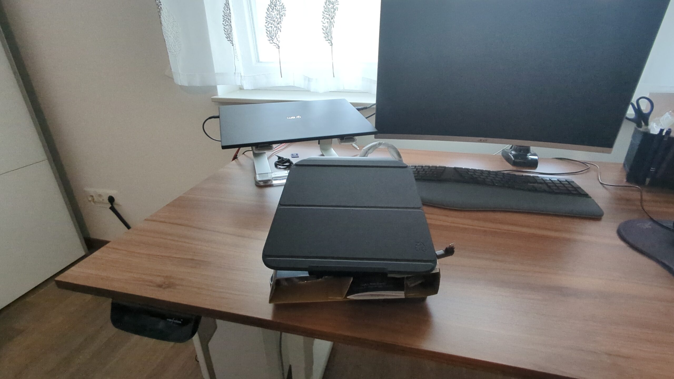 Der Fuß eignet sich außerdem gut als kleine Ablage für nicht benötigte Kabel oder Kleinteile. Eine integrierte Box wäre zwar eine schöne Ergänzung, aber auch so bleibt der Schreibtisch ordentlich und aufgeräumt.